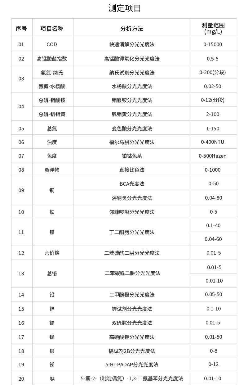 1、46項(xiàng)指標(biāo):直接測定化學(xué)需氧量(COD)、氨氮、總磷、總氮、懸浮物、色度、濁度、重金屬、有機(jī)污染物和無機(jī)污染物等多項(xiàng)指標(biāo),濃度直讀;